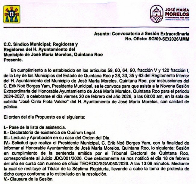 La Novena Sesión Extraordinaria está convocada para este viernes, a las 8 de la mañana, para que Erick Borges Yam, presidente municipal, informe sobre el cumplimiento de la sentencia al juicio JDC/001/2026, y cumpla con el regreso de esta regiduría a su titular.