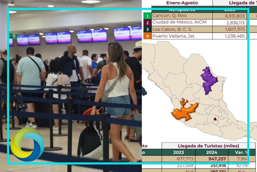 “Durante enero-agosto de 2024, los aeropuertos que recibieron el mayor número de turistas internacionales en México fueron, según su nacionalidad: Cancún, Q. Roo; Ciudad de México (AICM); Los Cabos, B.C.S.; Puerto Vallarta, Jal.; Guadalajara, Jal.; Monterrey, N. L.; Tulum Q. Roo y Cozumel, Q. Roo; los cuales, en su conjunto representaron el 92.4% del total de llegadas de turistas internacionales por nacionalidad”, señala el documento de Datatur.