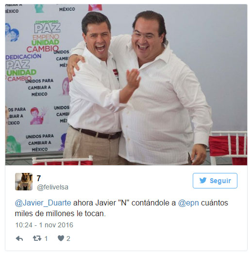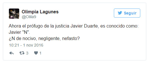 El comunicado de la PGR donde ha dado a conocer que aún no han encontrado al ex gobernador de Veracruz Javier Duarte, ha causado furor en redes sociales donde Javier “N” se ha convertido en tendencia, esto como burla debido al nombre con el que se señala al gobernador con licencia, esto por ser ya una persona conocida a nivel nacional.