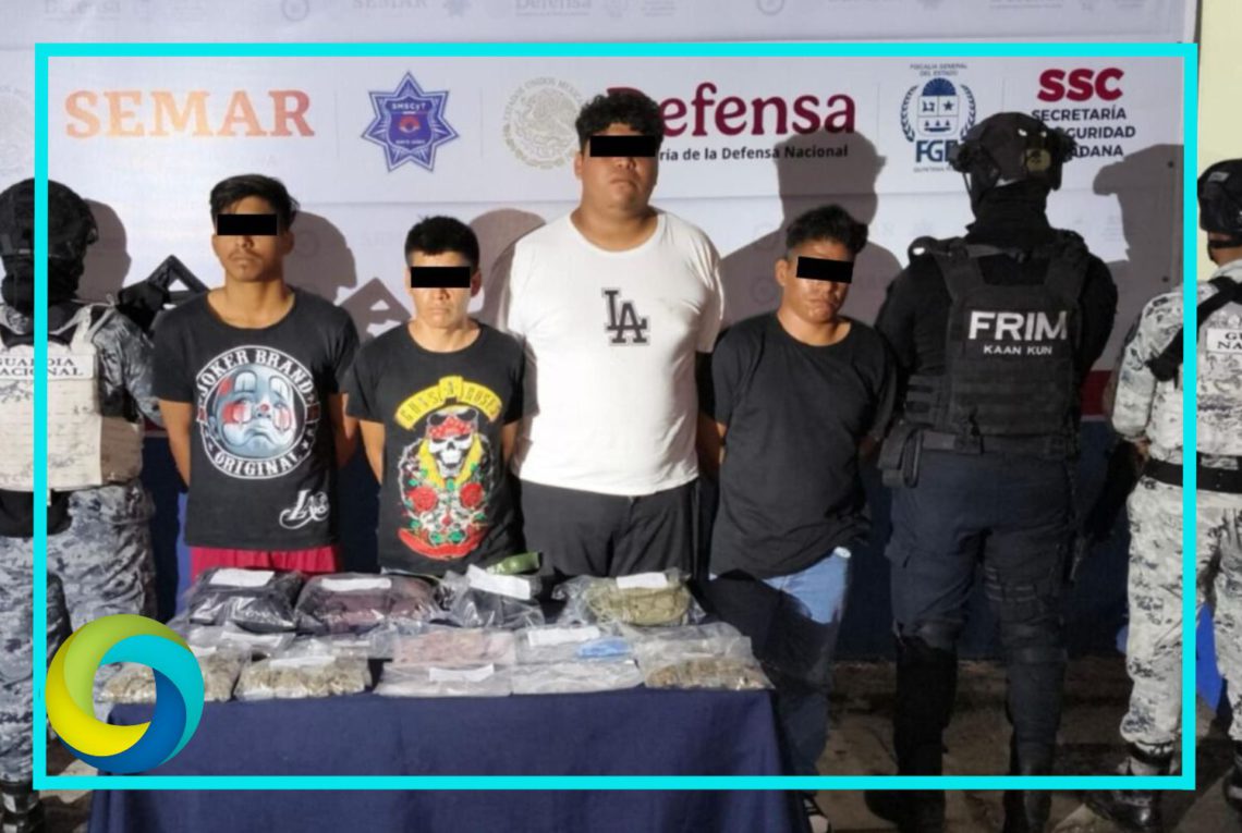 Benito Juárez.- Policías de Investigación adscritos a la Fiscalía General del Estado, en coordinación con elementos de la Guardia Nacional y de la Policía Municipal, detuvieron en flagrancia a cuatro masculinos por su presunta participación en hechos posiblemente constitutivos del delito contra la salud, en su modalidad de narcomenudeo.