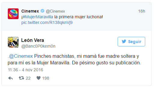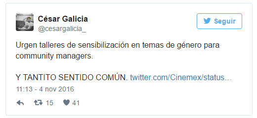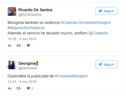 El polémico tuit, que lleva más de 3 mil retuits y casi 6 mil likes, permanece la red, por lo que usuarios Twitter han creado el hashtag #CinemexMisógino para demandar un pronunciamiento por parte de la empresa pues consideran que normaliza la violencia.