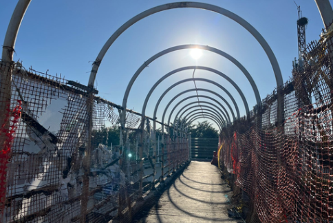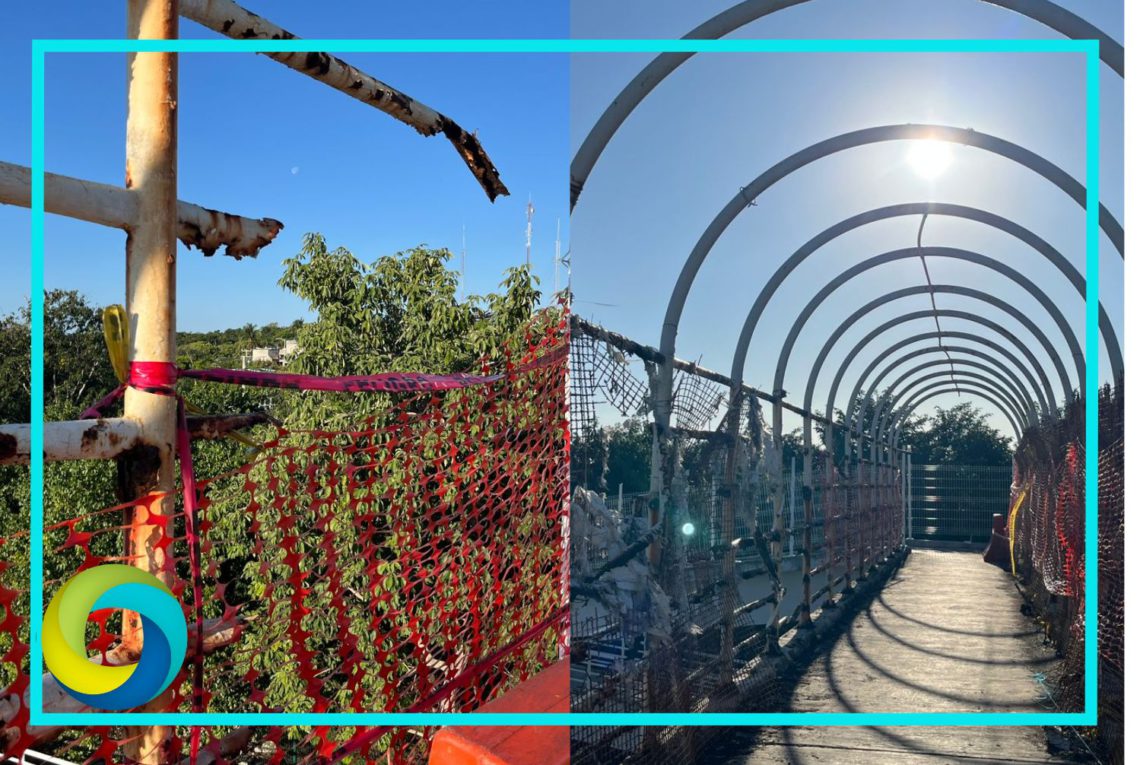 Sobre este paso, que cruza la carretera federal 307, autoridades colocaron algunas barreras y mallas de plástico, para evitar que ciudadanos toquen los barandales, que están completamente derruidos, o ausentes en algunos puntos.