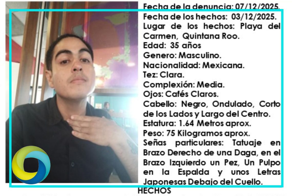 Su ficha de búsqueda fue emitida el 7 de diciembre, aunque se cree que su desaparición se dio el día 3 de ese mes. De acuerdo a su madre, testimonios indican que él caminaba por la carretera federal 307, entre Playa del Carmen y Tulum.