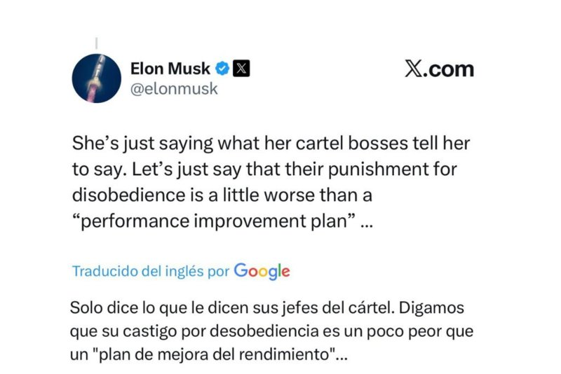 A través de X, Musk acusó a Sheinbaum de estar bajo el mando de los cárteles del narcotráfico, cuestionando su estrategia de seguridad. “Sólo repite lo que le dicen sus jefes del cártel”, se refirió Musk a la presidenta.