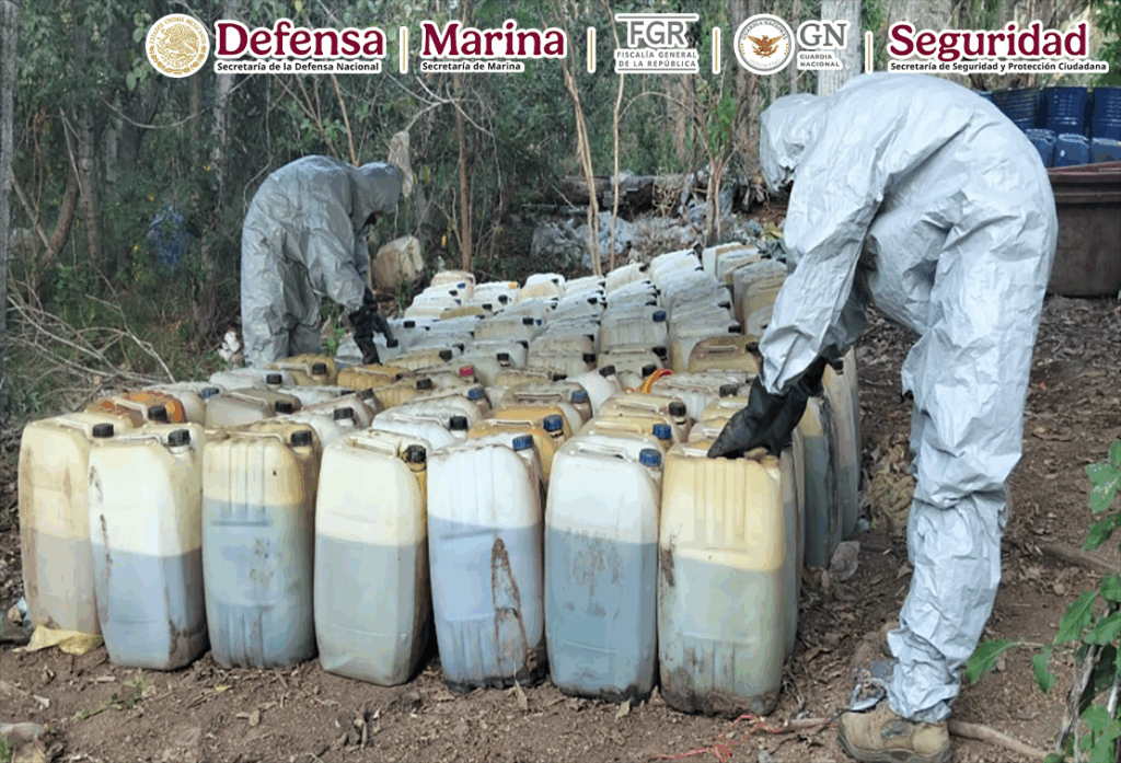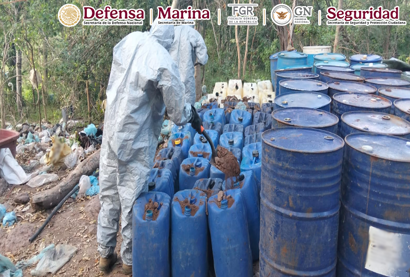 También en Culiacán se localizó un área de concentración de material diverso para la elaboración de drogas sintéticas donde se aseguraron 13,850 litros de sustancias químicas. La afectación económica a la delincuencia organizada es de 281 millones de pesos.