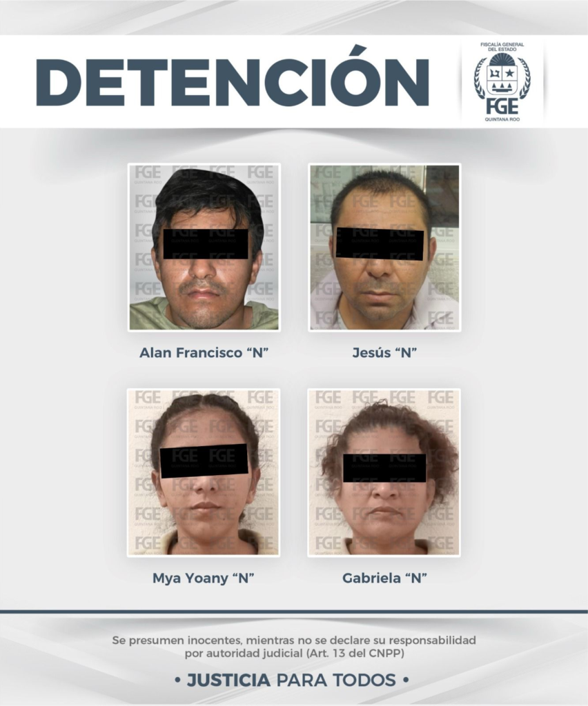 Othón P. Blanco.- La Fiscalía General del Estado de Quintana Roo informó sobre el cumplimento, por separado, de cuatro órdenes de aprehensión en contra de dos masculinos y dos mujeres, por su probable participación en hechos posiblemente constitutivos del delito de homicidio calificado, en agravio de un masculino de identidad reservada, ocurrido el 20 de diciembre de 2025, en este municipio.