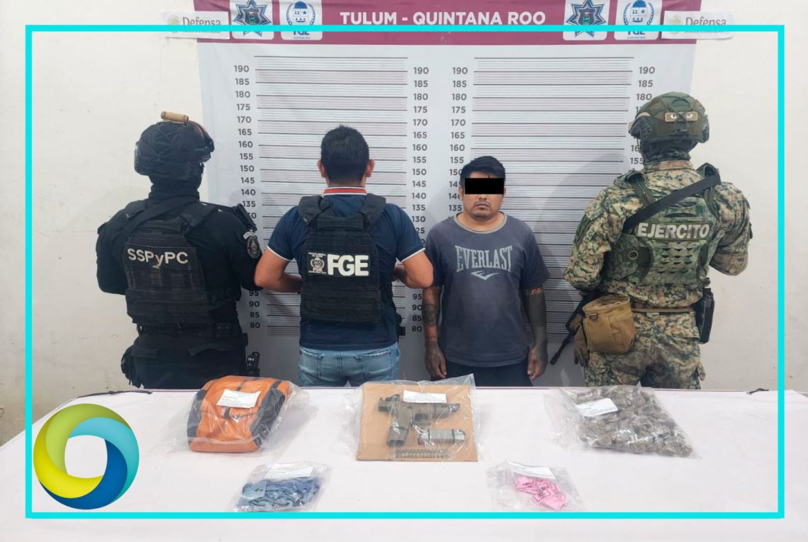 Tulum.- Por su presunta relación en hechos posiblemente constitutivos de delitos contra la salud en su modalidad de narcomenudeo, agentes de la Fiscalía General del Estado, Secretaría de la Defensa Nacional y Policía Municipal, detuvieron en flagrancia a dos masculinos, a quienes le aseguraron presuntos estupefacientes y un arma de fuego, en este municipio.