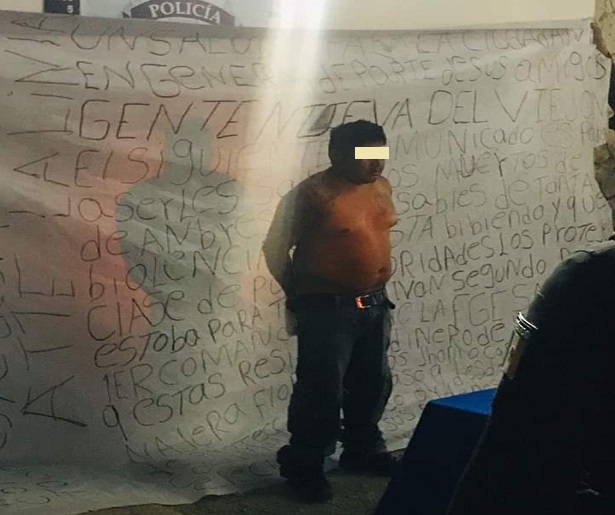 El presunto “mensajero” de un grupo delictivo, de nombre Jorge Arturo, de 32 años, fue puesto a disposición del Ministerio Público por delitos contra la salud y amenazas, las cuales estaban escritas en una lona, dirigidas aparentemente a un comandante de la Policía Ministerial.