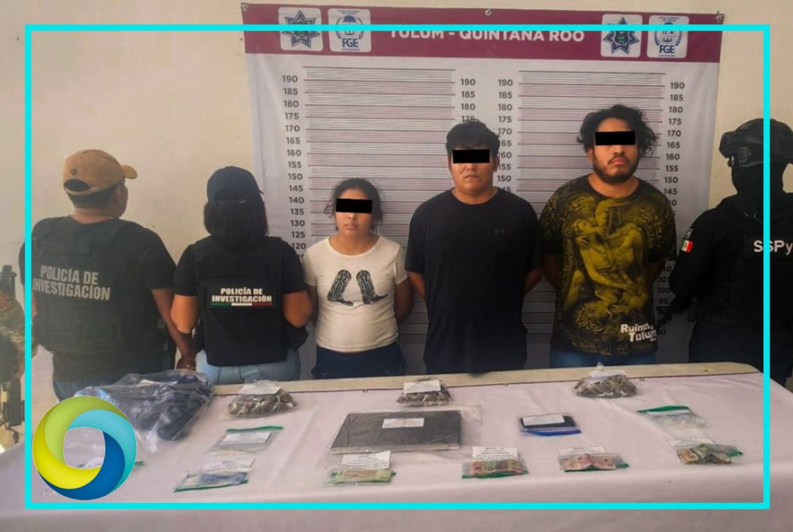 Tulum.- Policías de Investigación, adscritos a la Fiscalía General del Estado, en coordinación con elementos de la Secretaría de la Defensa Nacional y la Secretaría de Seguridad Ciudadana Municipal, detuvieron en flagrancia a dos masculinos y una femenina, por su presunta relación en hechos probablemente constitutivos de delitos contra la salud, en su modalidad de narcomenudeo, en este municipio.