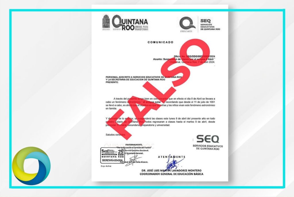 La Secretaría de Educación de Quintana Roo (SEQ) desmintió un documento que circula en redes sociales sobre una supuesta suspensión de clases este lunes 8 de abril, debido a fenómeno de eclipse solar.