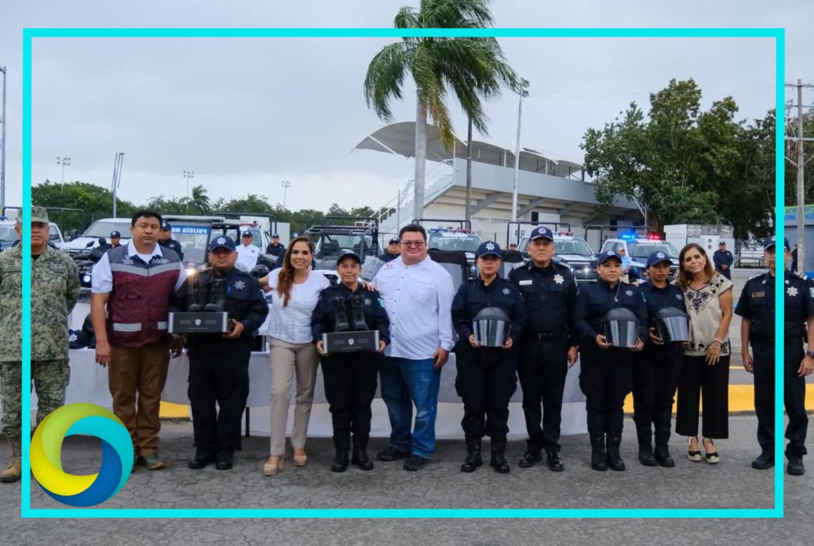 Cozumel.– Con propósito de cuidar la vida, prevenir la violencia y generar confianza, la gobernadora Mara Lezama Espinosa encabezó en Cozumel la renovación y fortalecimiento del parque vehicular, así como la entrega de prendas de protección, vestuario, uniformes, vehículos, mobiliario y equipo tecnológico para la Policía Municipal, como parte de una estrategia integral de construcción de paz con sentido social y transparencia.
