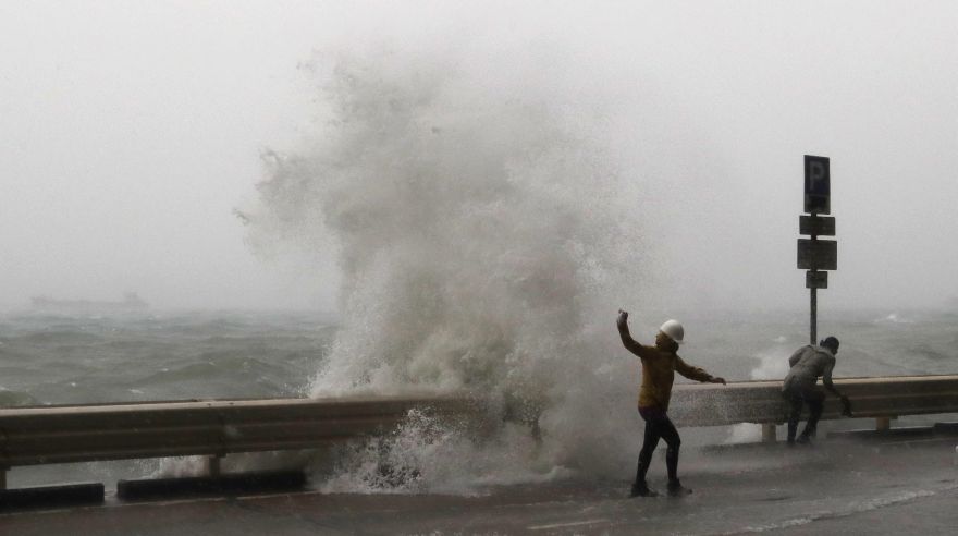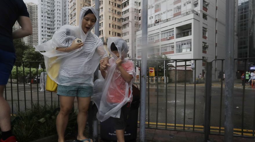 En el barrio de Kennedy Town, al oeste de la isla, las personas se apuraron a llegar hasta las barreras de seguridad y traspasarlas para mojarse con las olas.