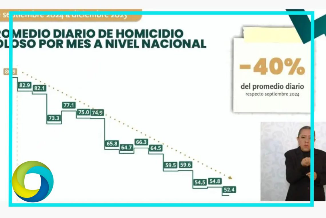 El promedio diario de asesinatos descendió de 86,9 a 52,4 entre septiembre de 2024, último mes del expresidente Andrés Manuel López Obrador (2018-2024), y diciembre de 2025, lo que implica 34 homicidios menos cada día, apuntó Sheinbaum. Destacó además que el dato de diciembre de 2025 es el más bajo en los últimos 10 años, al revisar los registros desde 2016.