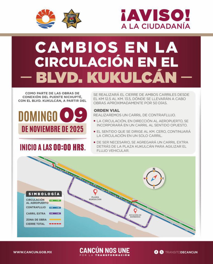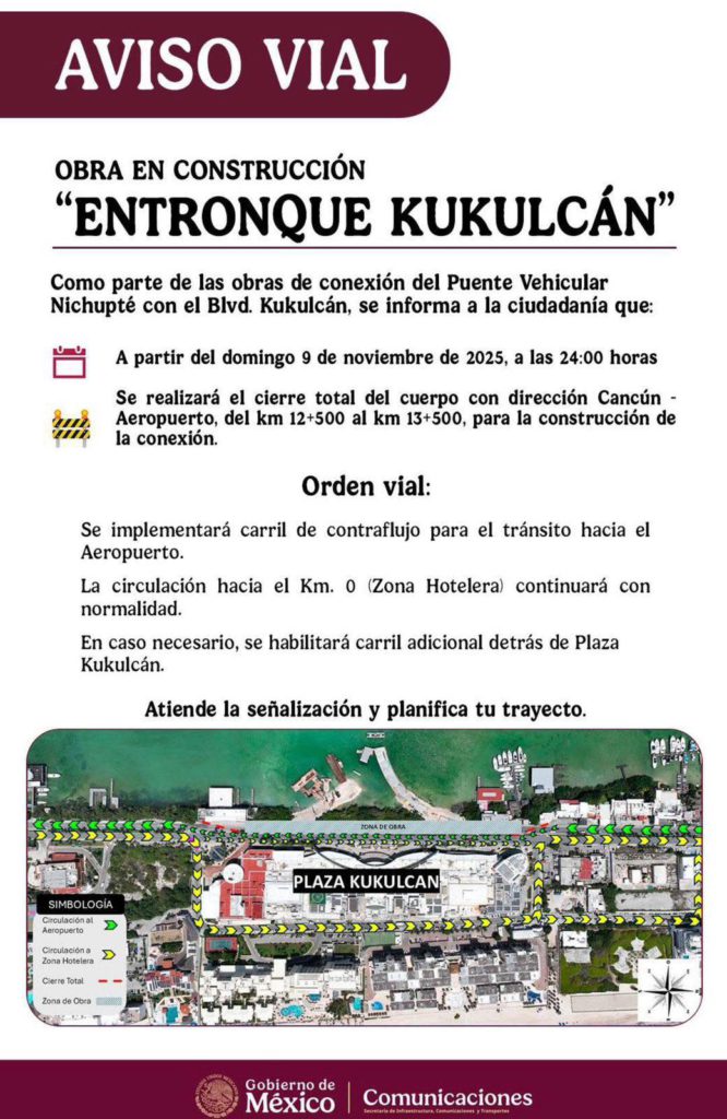 El Gobierno de Benito Juárez, Quintana Roo, informó que la construcción del Puente Vehicular Nichupté entra en su fase de conexión con el bulevar Kukulcán, por lo que se realizará un cierre total del cuerpo con dirección Cancún–Aeropuerto, a la altura del kilómetro 12+500 al 13+500, a partir de las 24:00 horas del domingo 9 de noviembre.