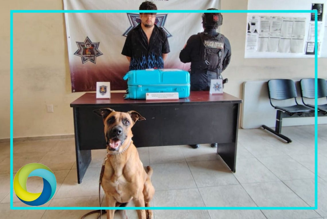 Durante recorridos de vigilancia en la central de autobuses ADO en Tulum, elementos del Grupo Canino K-9 de la Secretaría de Seguridad Ciudadana, con apoyo del canino Kaiser y en presencia de los pasajeros, el conductor y el vigilante, realizaban una inspección al autobús número 0477, cuando el ejemplar hizo un marcaje positivo a una maleta de viaje de plástico color azul.