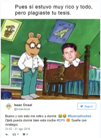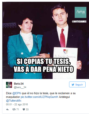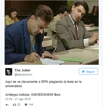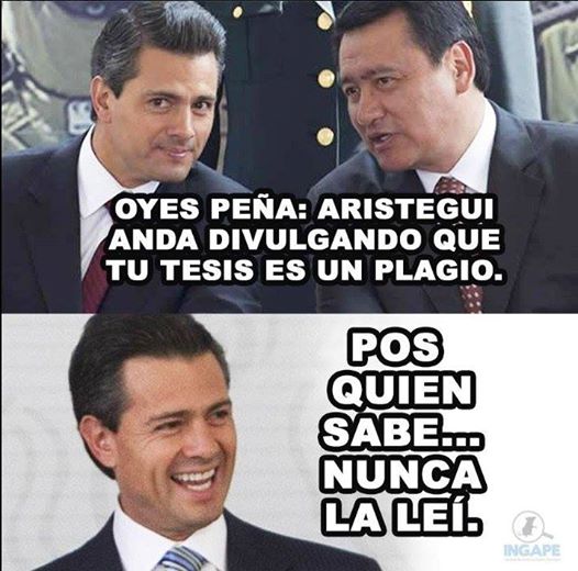Casi una tercera parte de la tesis universitaria de Enrique Peña Nieto fue plagiada, según el equipo de investigadores de Carmen Aristegui. Las redes sociales no tardaron en convertirse en un hervidero de memes al respecto. Los usuarios se dividen entre los críticos del presidente y los que piensan que la noticia de la periodista no tiene el impacto que se esperaba. Aquí una selección de los mejores: