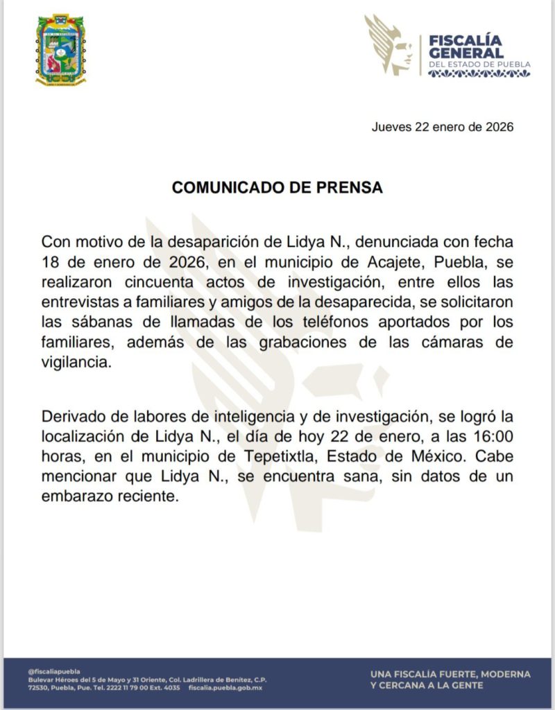 Después de cuatro días de intensa búsqueda, Lidya Valdivia Juárez, la mujer reportada como desaparecida desde el pasado 18 de enero de 2026, fue localizada con vida este jueves 22 de enero en el municipio de Tepetixtla, Estado de México, confirmó la Fiscalía General del Estado (FGE) de Puebla.