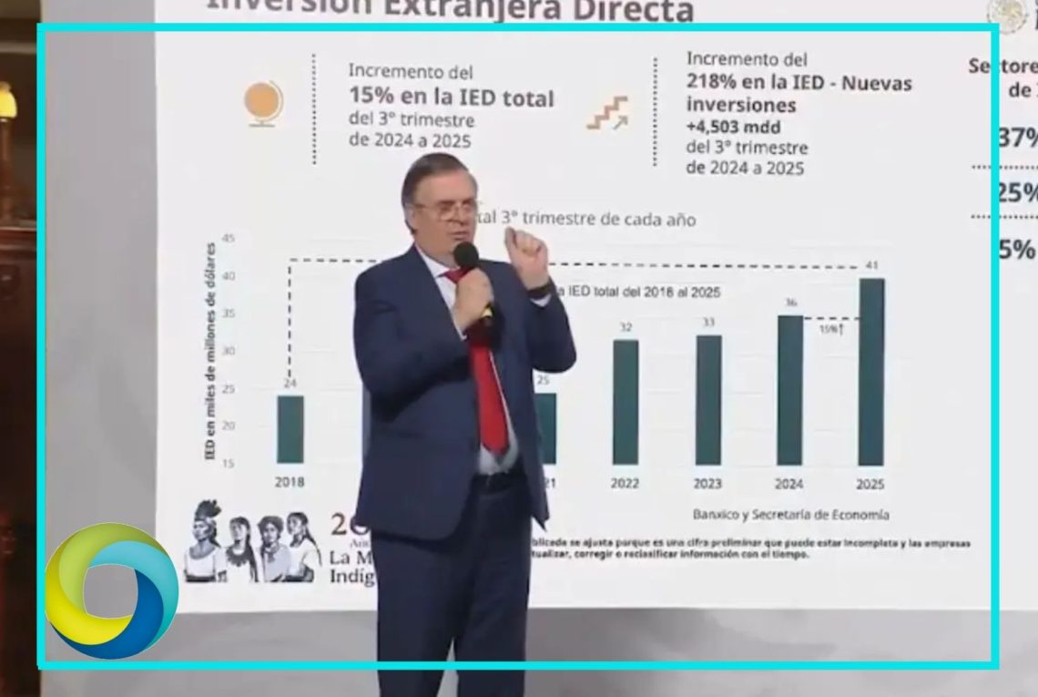 El secretario de Economía, Marcelo Ebrard, destacó este miércoles que México alcanzó un récord histórico en inversión extranjera directa, con casi 41 mil millones de dólares en el último trimestre, lo que representa un crecimiento del 15 por ciento respecto a 2024.