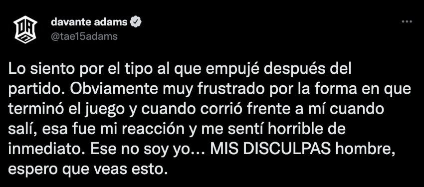 Por su parte, Davante Adamas se disculpó a través de redes sociales con el chico que se encontraba en el terreno de juego, señalando que fue su primera reacción tras el final del partido y que, ‘ese no es él’.