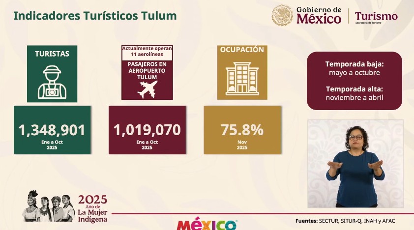Previamente, la funcionaria federal indicó que de enero a octubre, Tulum ha recibido más de un millón 300 mil turistas, con un incremento del 9.4% en el número de pasajeros, y una ocupación hotelera actual del 75.8%, ya que se ha dejado atrás a la temporada baja.