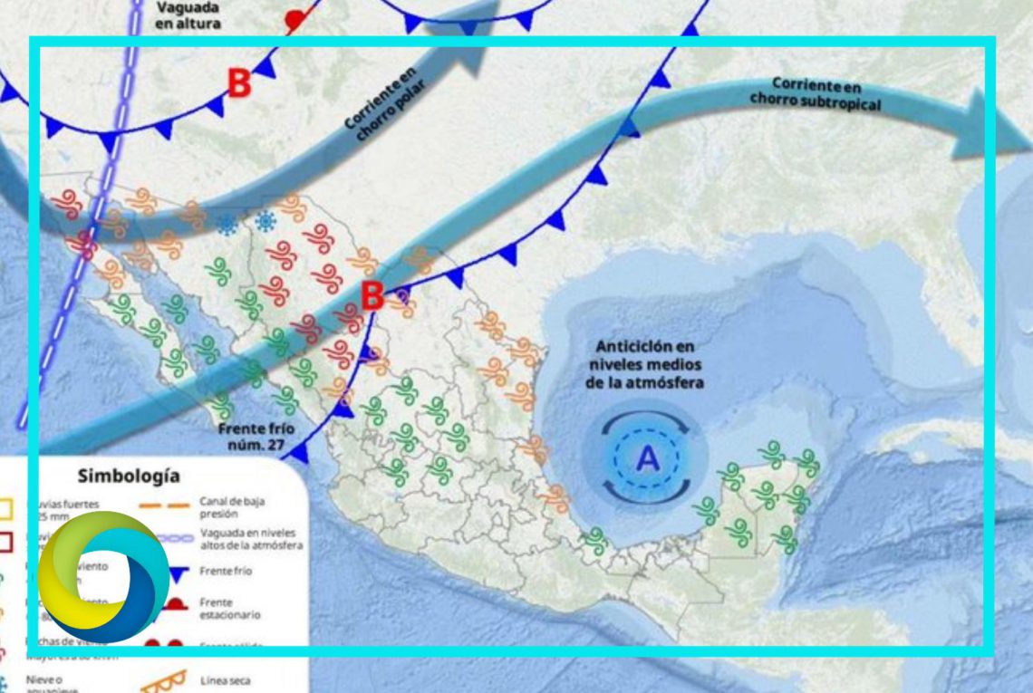 A su vez, el ingreso de humedad del océano Pacífico y mar Caribe propiciará lluvias y chubascos con posibles descargas eléctricas en el occidente, sur y sureste del territorio mexicano, incluida la península de Yucatán.