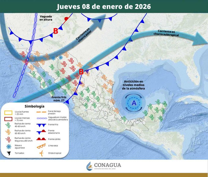En el resto del país, una circulación anticiclónica en niveles medios de la atmósfera mantendrá cielo despejado a parcialmente nublado con baja probabilidad de lluvia, ambiente frío a muy frío durante la mañana y heladas sobre entidades de la Mesa del Norte y la Mesa Central.