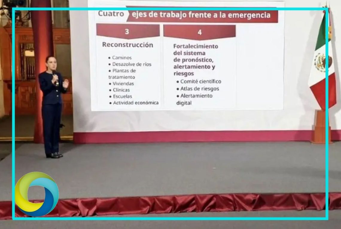 La presidenta Claudia Sheinbaum anunció este lunes que su gobierno trabaja en cuatro ejes para mejorar la atención a las emergencias, los cuales se aplicarán en Veracruz, Hidalgo, Puebla, Querétaro y San Luis Potosí, los cinco estados afectados por las lluvias.
