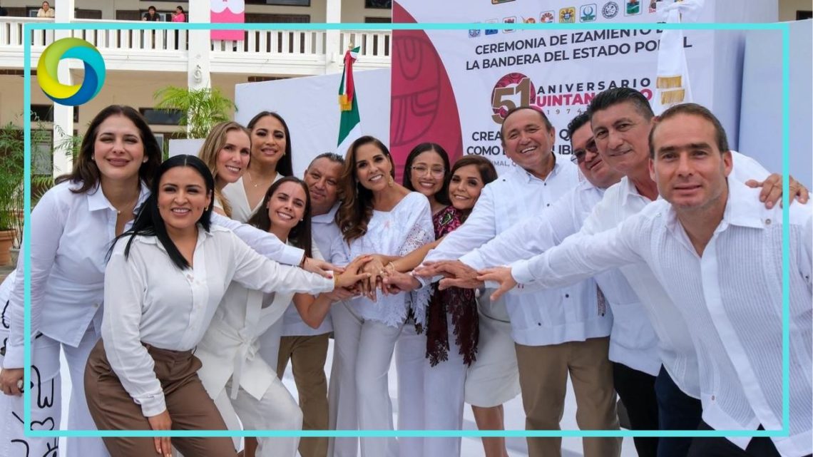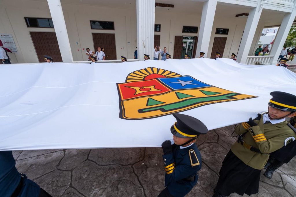 Chetumal.- La gobernadora Mara Lezama Espinosa encabezó la ceremonia de izamiento de la bandera de Quintana Roo en ocasión del 51 aniversario de su creación como Estado Libre y Soberano, evento en el que se estrenó la Banda de Guerra Monumental de más de 112 elementos, niños y jóvenes, así como las escoltas de Bandera Nacional y Estatal que se integra con 8 organizaciones cívicas libres y planteles educativos.