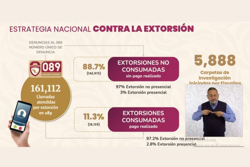 Agregó que de estas denuncias derivaron 5 mil 588 carpetas de investigación y la detención de 907 presuntos extorsionadores en 24 entidades de México.