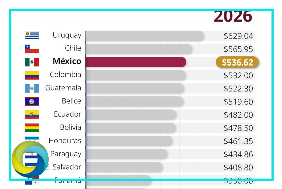 De acuerdo con cifras presentadas por la mandataria y datos de la Secretaría del Trabajo y Previsión Social, México alcanzó un salario mínimo equivalente a 536.62 dólares mensuales, solo por debajo de Uruguay (629.04 dólares) y Chile (565.95 dólares). En 2025, el país ocupaba el sexto lugar en este mismo indicador.