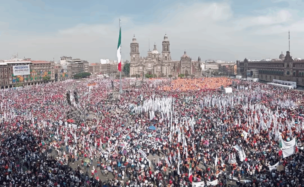 ‘Que nadie se equivoque, que se oiga bien fuerte y lejos: las y los jóvenes están en su gran mayoría con la transformación de la vida pública de México’, afirmó desde el templete instalado en el Zócalo capitalino.