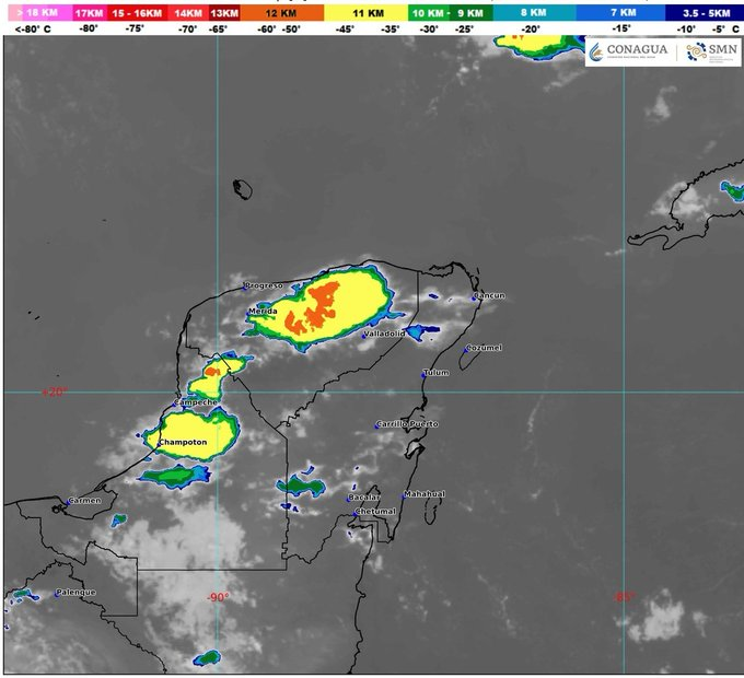 Para la Península de Yucatán el pronóstico es de cielo medio nublado a nublado en el transcurso del día, con chubascos y posibles descargas eléctricas en Campeche, Yucatán y Quintana Roo.