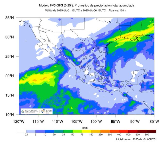 A su vez, un río atmosférico sobre el noroeste y occidente del país propiciará rachas fuertes de viento en dichas regiones, además de lluvias aisladas en Zacatecas; con probabilidad de caída de aguanieve en sierras de Durango.