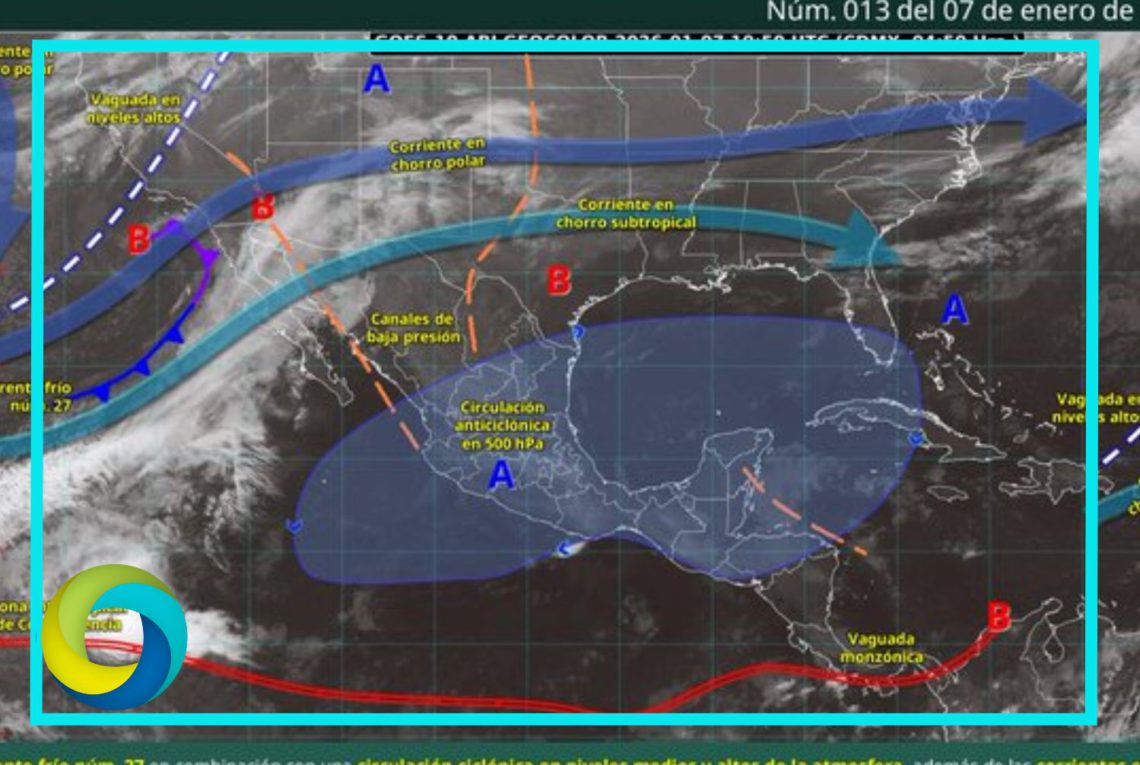 Finalmente, una circulación anticiclónica en niveles medios de la atmósfera mantendrá cielo despejado o poco nuboso y escasa probabilidad de lluvia sobre gran parte del territorio nacional; prevaleciendo el ambiente frío a muy frío durante la mañana y noche, con heladas al amanecer sobre la Mesa del Norte y la Mesa Central.
