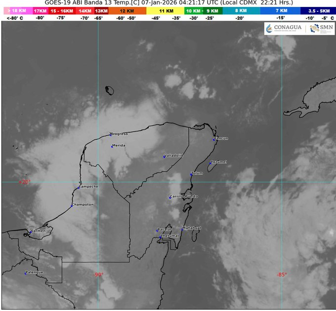 El Servicio Meteorológico Nacional (SMN) informó que para hoy el pronóstico del tiempo en la Península de Yucatán será de cielo despejado a medio nublado con probabilidad de lluvias aisladas en Quintana Roo. Bancos de niebla. Sin lluvia en Campeche y Yucatán.