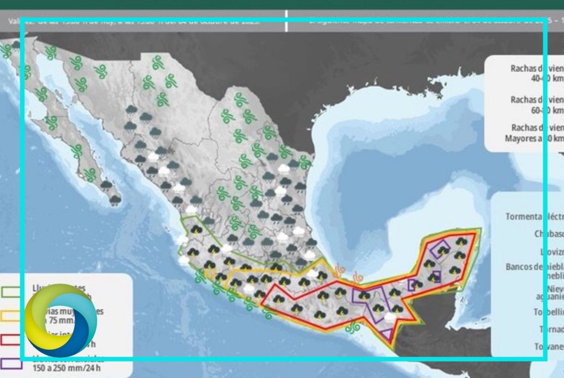 Un canal de baja presión prevalecerá en el centro y sur del golfo de México, en interacción con una vaguada en altura, inestabilidad atmosférica y los desprendimientos nubosos de la vaguada monzónica en el Pacífico Sur Mexicano, mantendrán la probabilidad de lluvias muy fuertes a puntuales intensas en el oriente y sureste de la República Mexicana, incluida la península de Yucatán.
