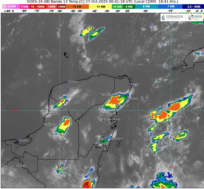 Por otro lado, canales de baja presión sobre el interior del país y la península de Yucatán, en combinación con el ingreso de humedad del océano Pacífico, golfo de México y mar Caribe, e inestabilidad atmosférica, originarán lluvias y chubascos dispersos en estados del noreste, occidente, oriente, centro, noreste, oriente, sur y sureste mexicano, incluyendo la península de Yucatán.