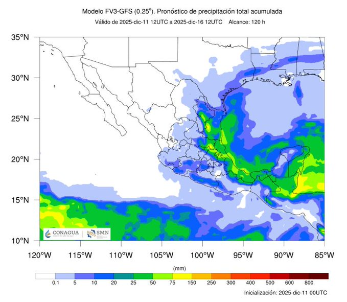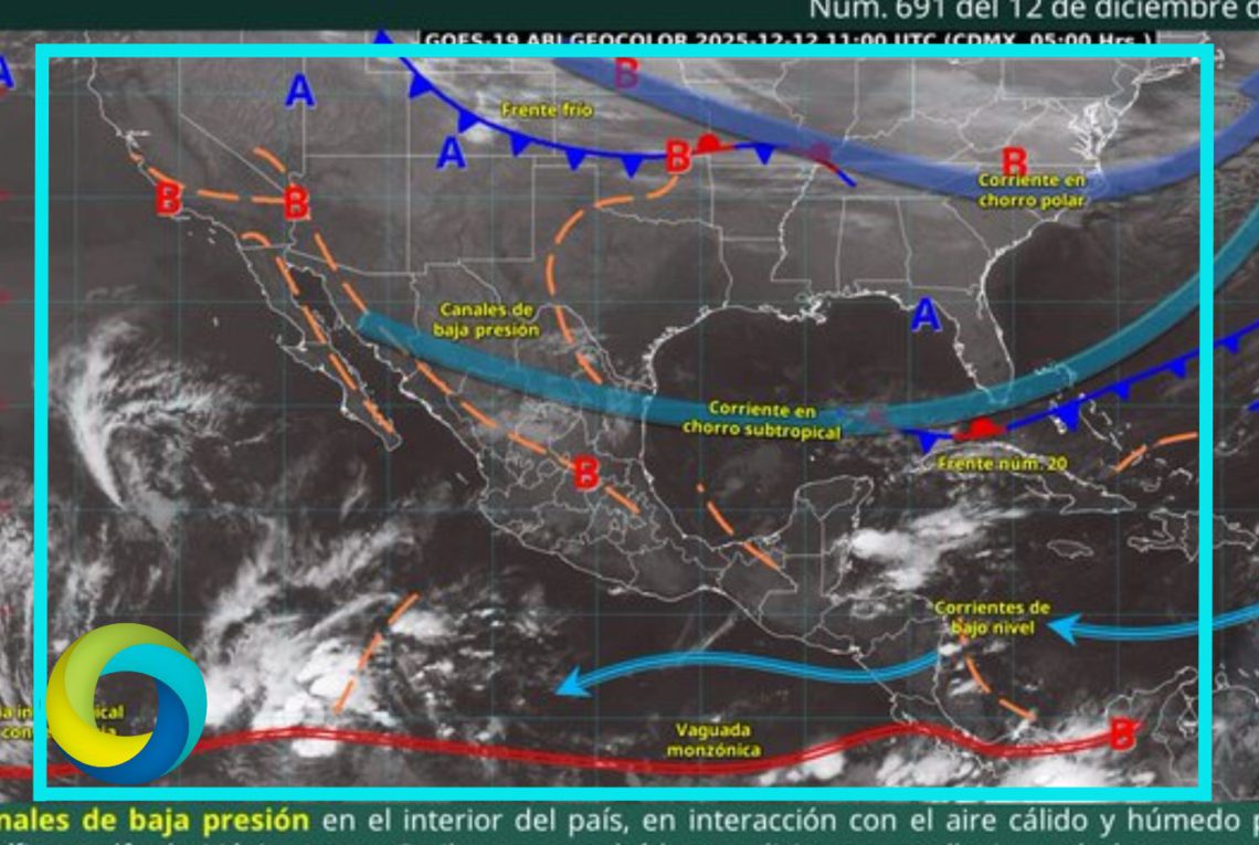 Por otro lado, canales de baja presión en el interior del país, en interacción con el aire cálido y húmedo procedente del océano Pacífico, golfo de México y mar Caribe, mantendrá las condiciones para lluvias y chubascos con descargas eléctricas y posible caída de granizo en los estados del occidente, centro, sur y sureste del territorio nacional, incluido el Valle de México y la península de Yucatán, con lluvias puntuales fuertes en Yucatán y Quintana Roo.