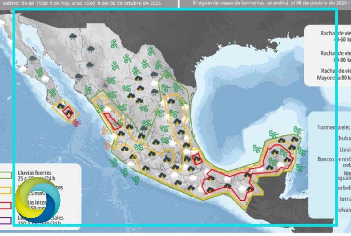 Dichas lluvias podrían originar encharcamientos e inundaciones. Viento del este y noreste de 20 a 30 km/h con rachas de 40 a 50 km/h en costas de Campeche, y rachas de hasta 40 km/h en Yucatán y Quintana Roo.