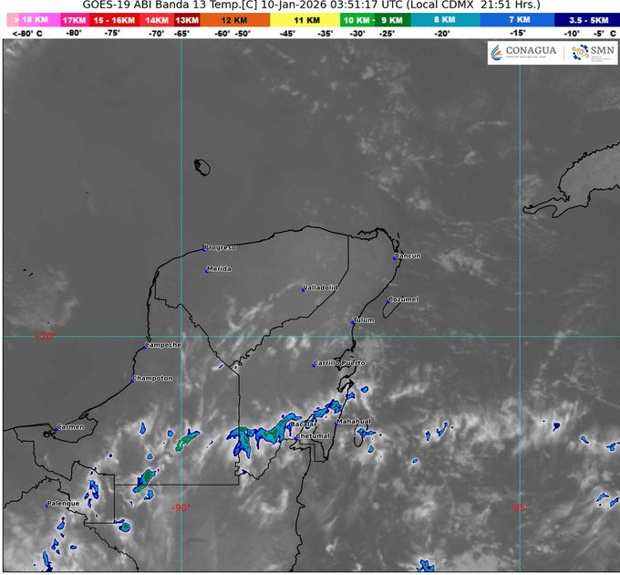 Para la Península de Yucatán habrá cielo medio nublado a nublado durante el día con probabilidad de lluvias puntuales muy fuertes en Campeche e intervalos de chubascos en Yucatán y Quintana Roo.