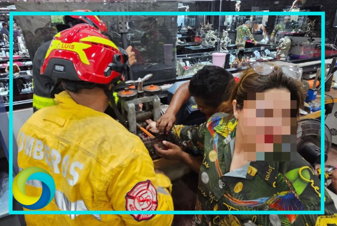 Playa del Carmen.- Una mujer que trabajaba de orfebre para una joyería estuvo a poco de perder dos dedos, luego que quedaran atrapados por un rodillo laminador, por lo que bomberos debieron liberarle la mano.