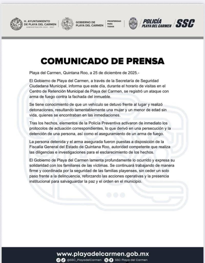 De acuerdo con el Gobierno de Playa del Carmen, la mañana del 25 de diciembre se registró un ataque con arma de fuego contra la fachada del Centro de Retención Municipal, durante el horario de visitas, lo que dejó como saldo una mujer y un menor de edad sin vida.